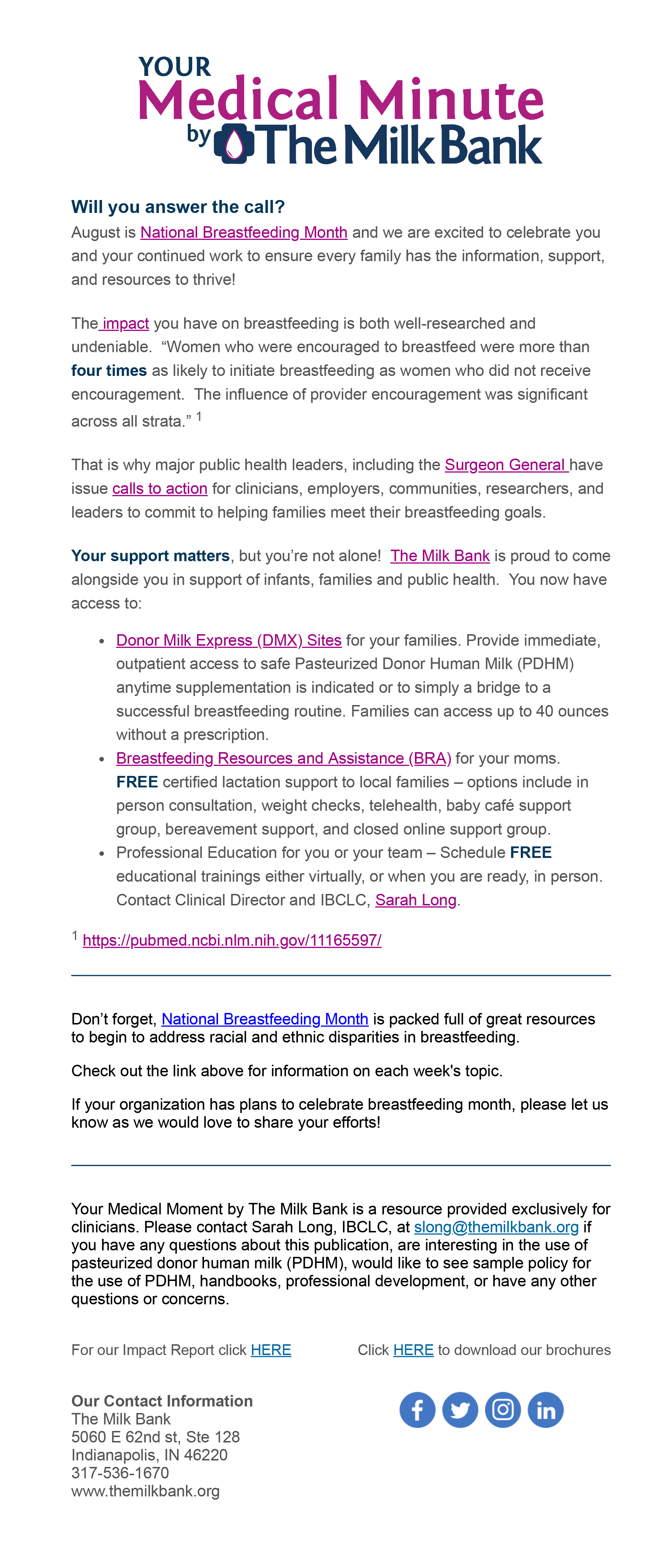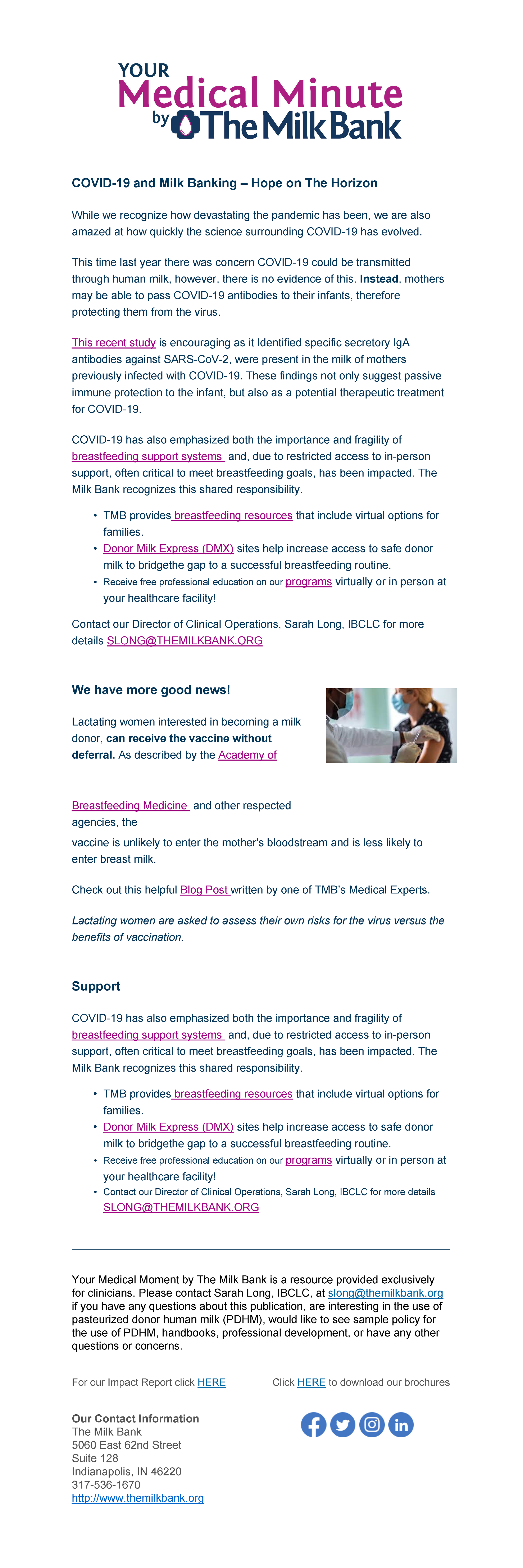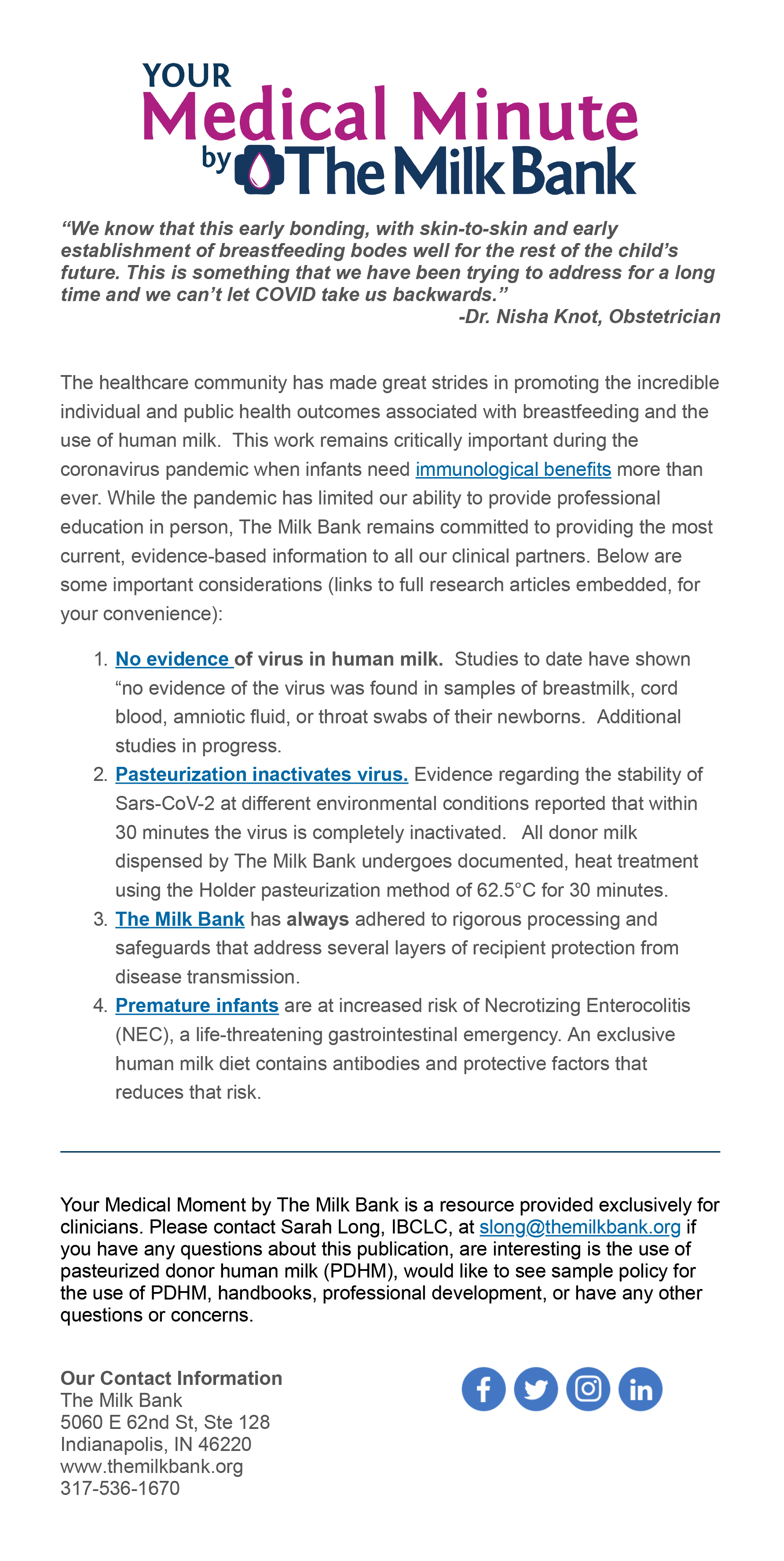 Your Medical Minute by The Milk Bank is a great way for clinicians, lactation champions, or super science nerds (it’s ok, we’re super science nerds, too) to stay informed of current research and best practices. Your Medical Minutes is published bi-monthly. Register here to be added to the mailing list!